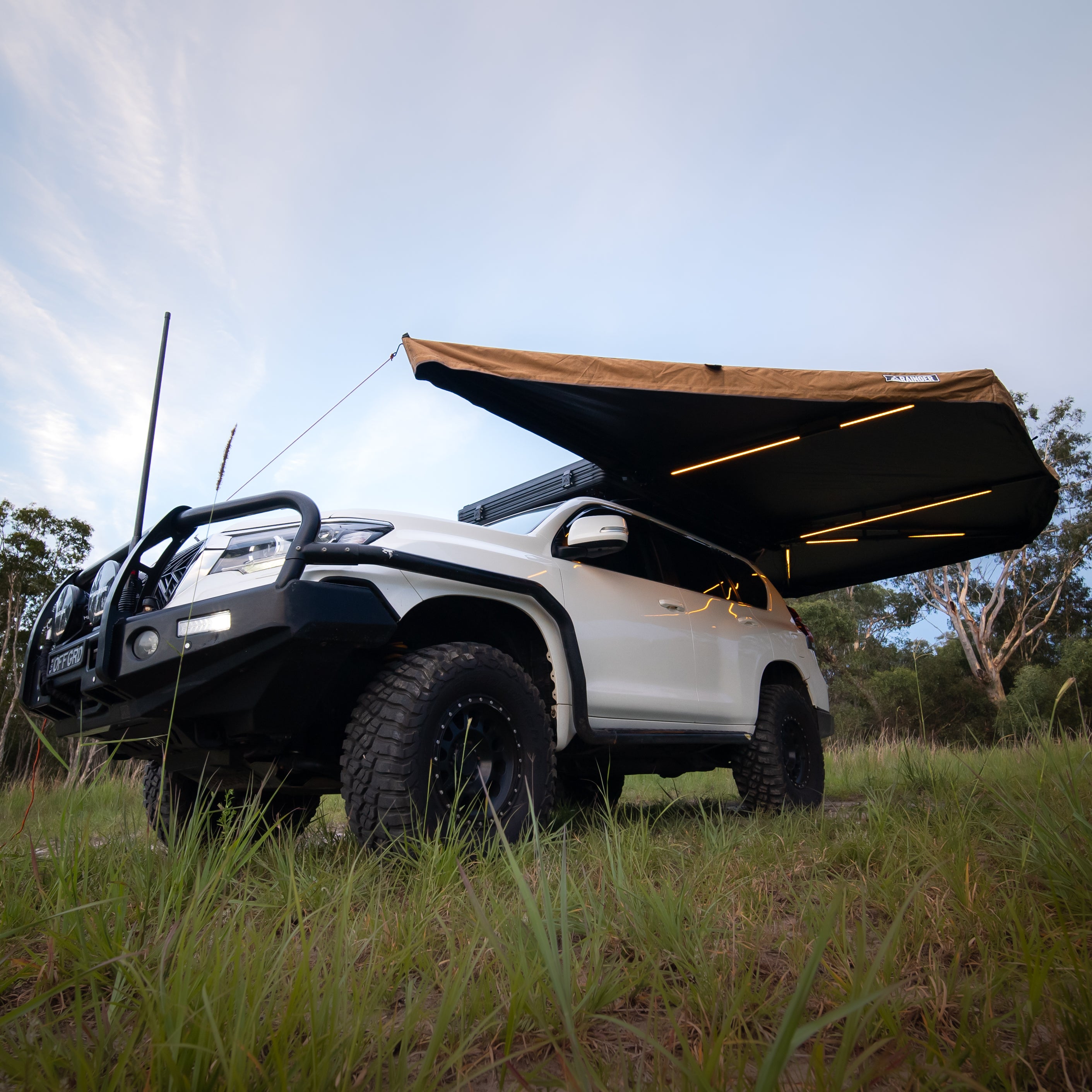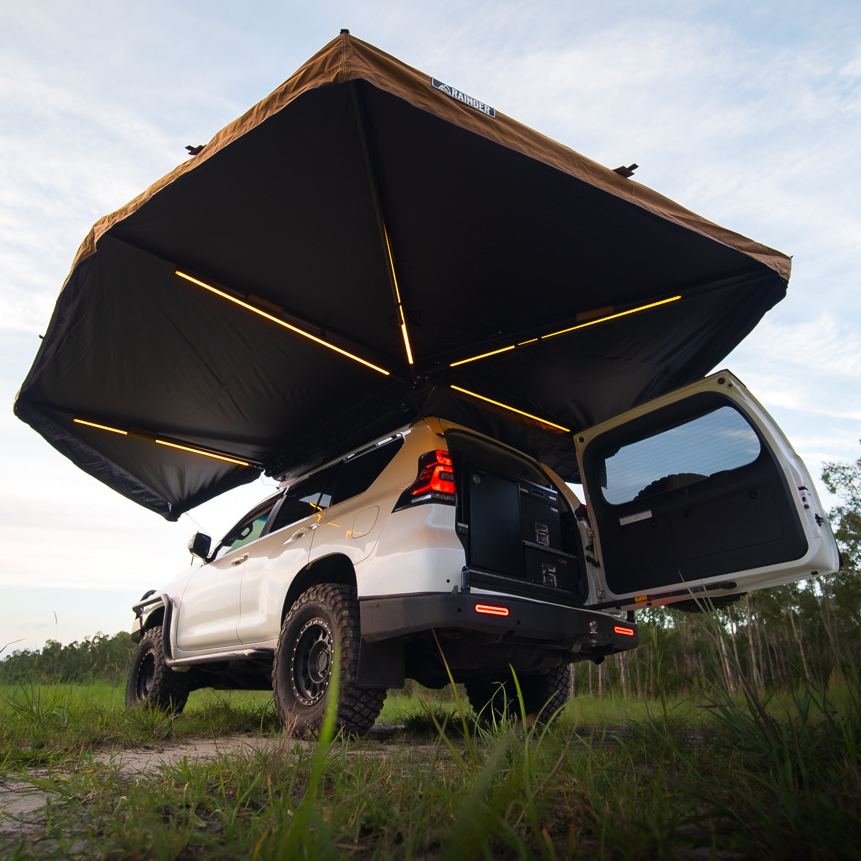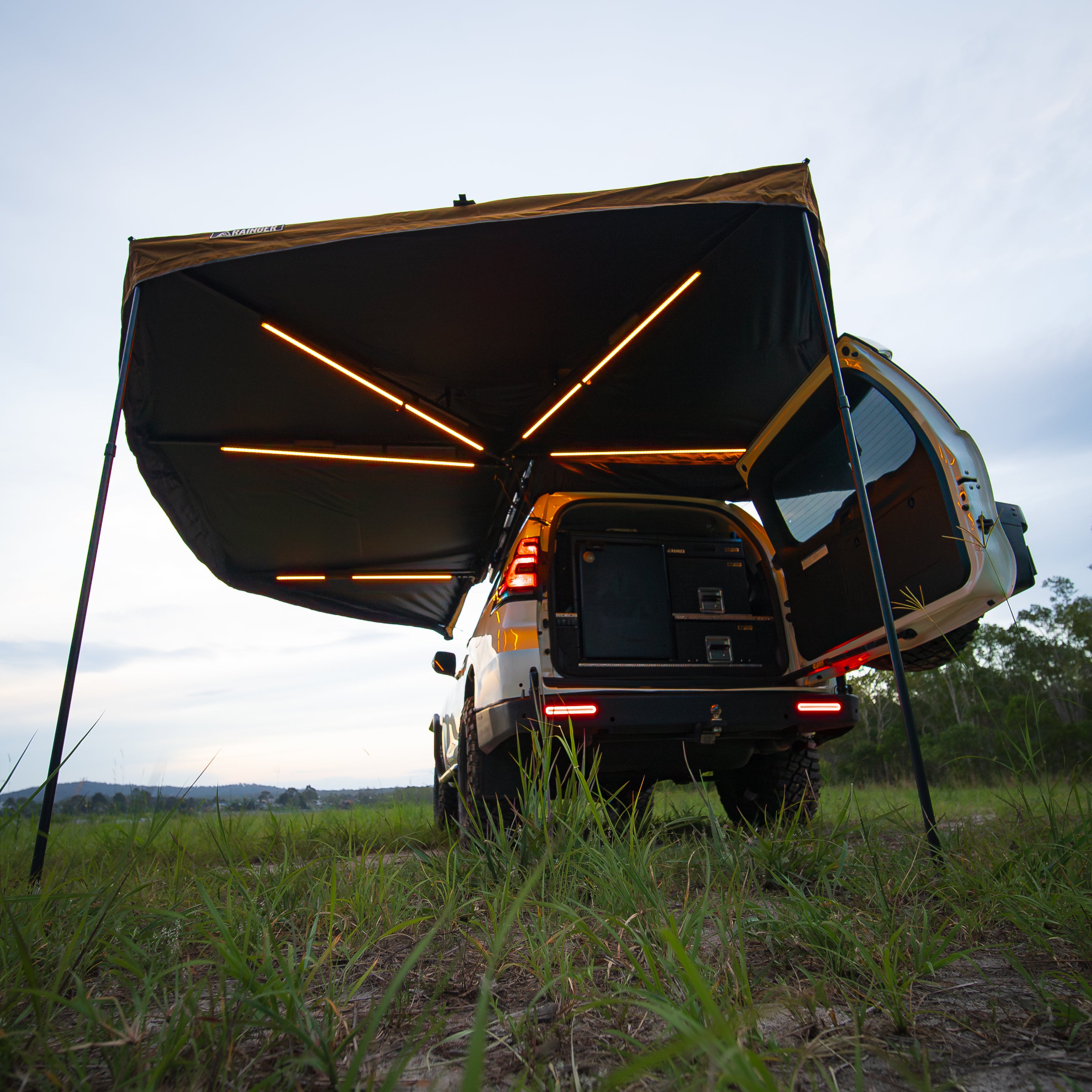 An ultra-quick, 6-arm freestanding 270° awning that deploys in seconds. Shade by day, light by night—the Rainger 270 throws serious cover down the side and rear of your rig, then lights up camp with LEDs on Five of six arms. Built from premium 280 GSM blackout ripstop canvas, finished in Desert Tan with coffee-brown nylon edging or Midnight Black for a stealth look. At only ~29 kg, it’s tough, tidy, and touring-ready.