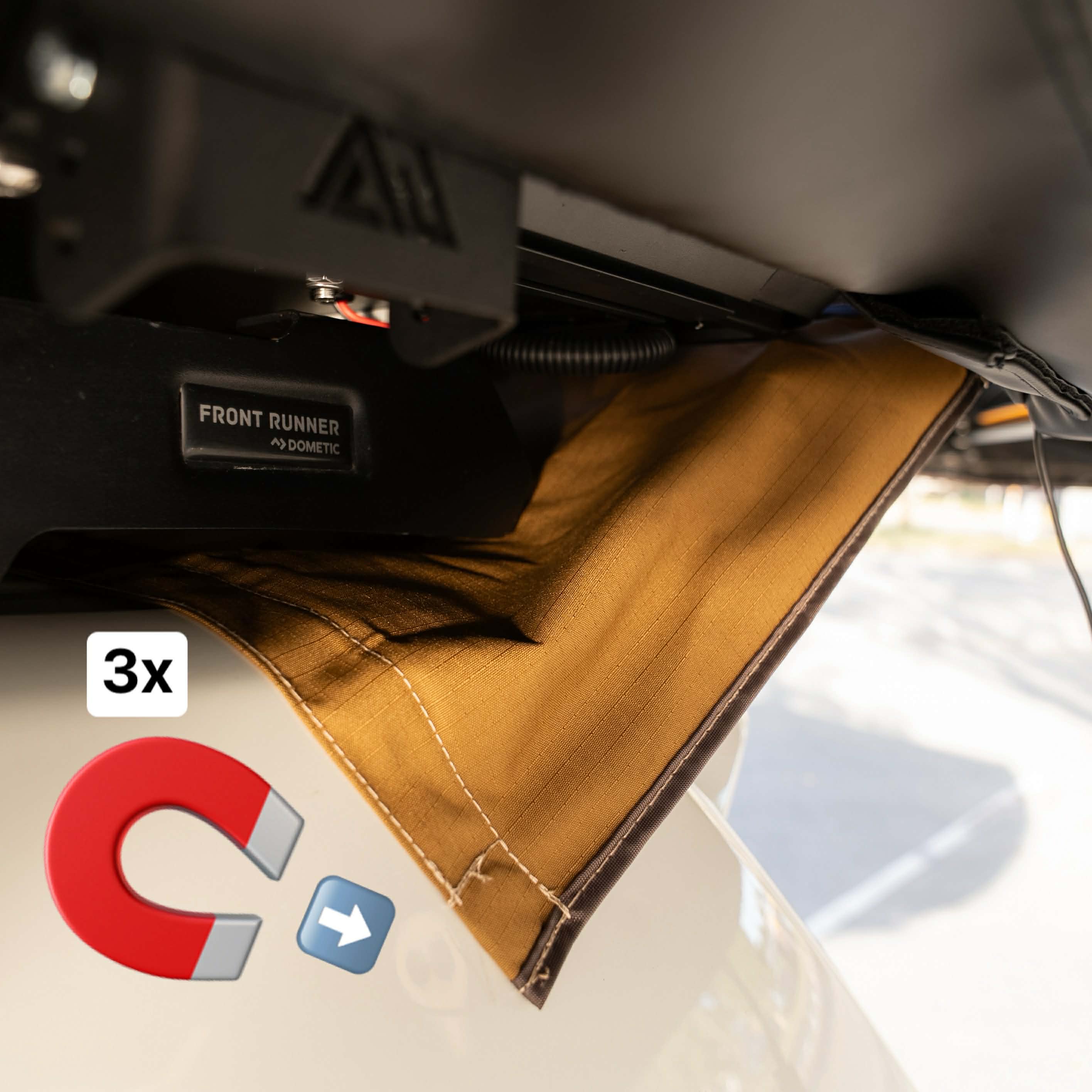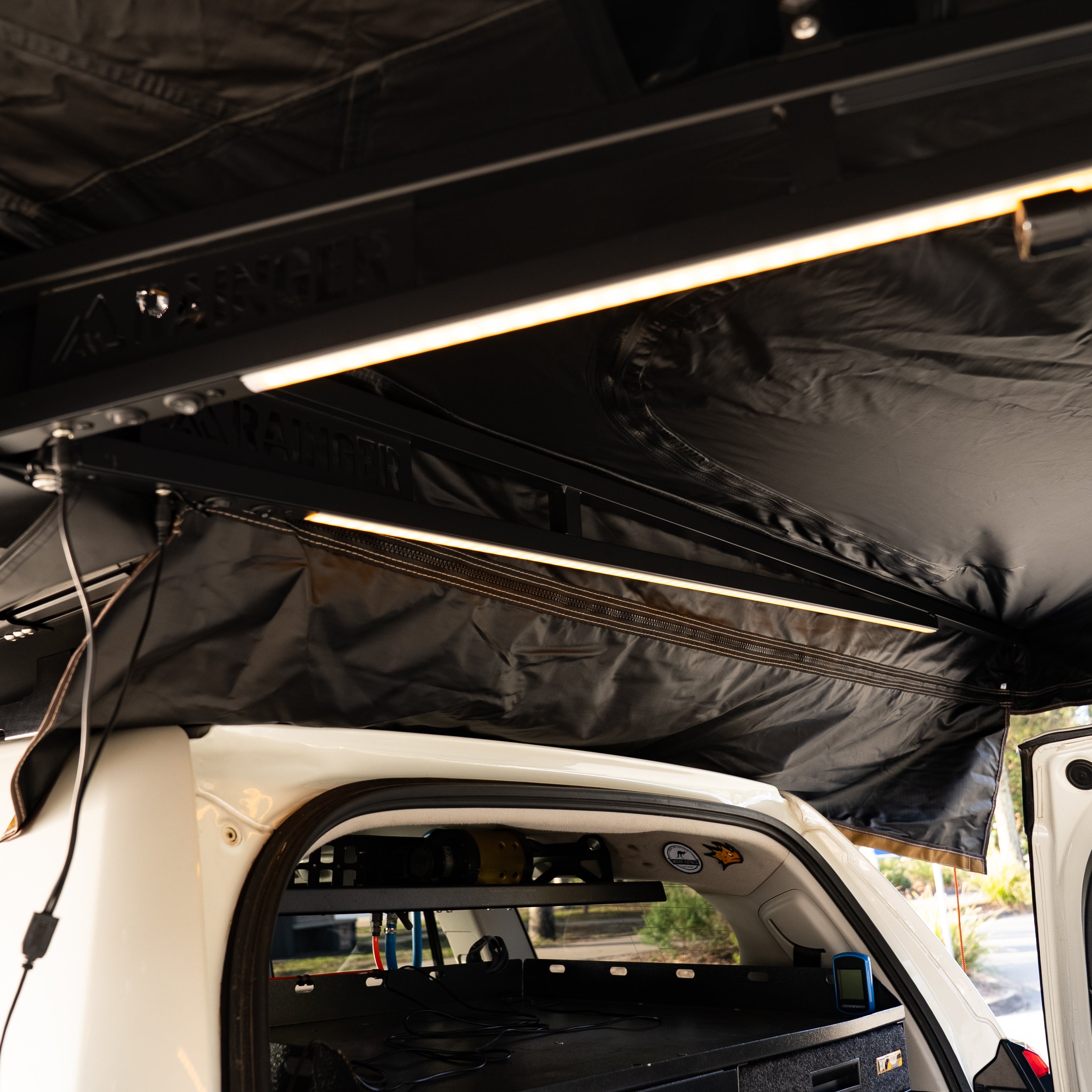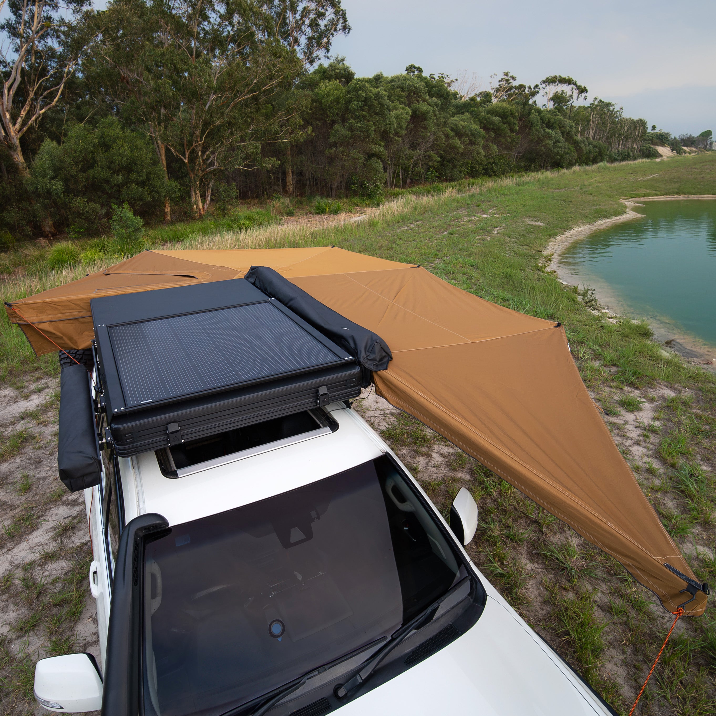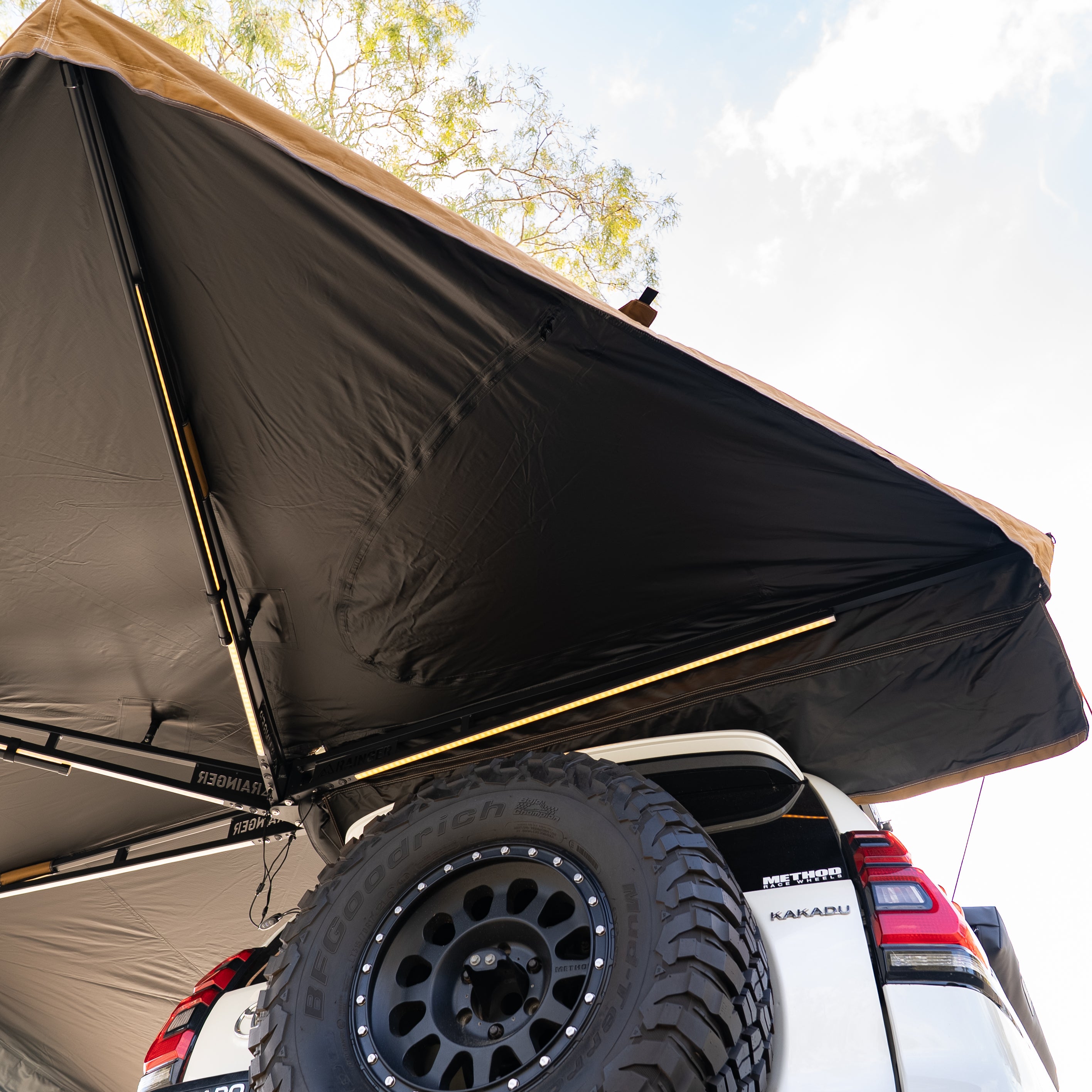 An ultra-quick, 6-arm freestanding 270° awning that deploys in seconds. Shade by day, light by night—the Rainger 270 throws serious cover down the side and rear of your rig, then lights up camp with LEDs on Five of six arms. Built from premium 280 GSM blackout ripstop canvas, finished in Desert Tan with coffee-brown nylon edging or Midnight Black for a stealth look. At only ~29 kg, it’s tough, tidy, and touring-ready.