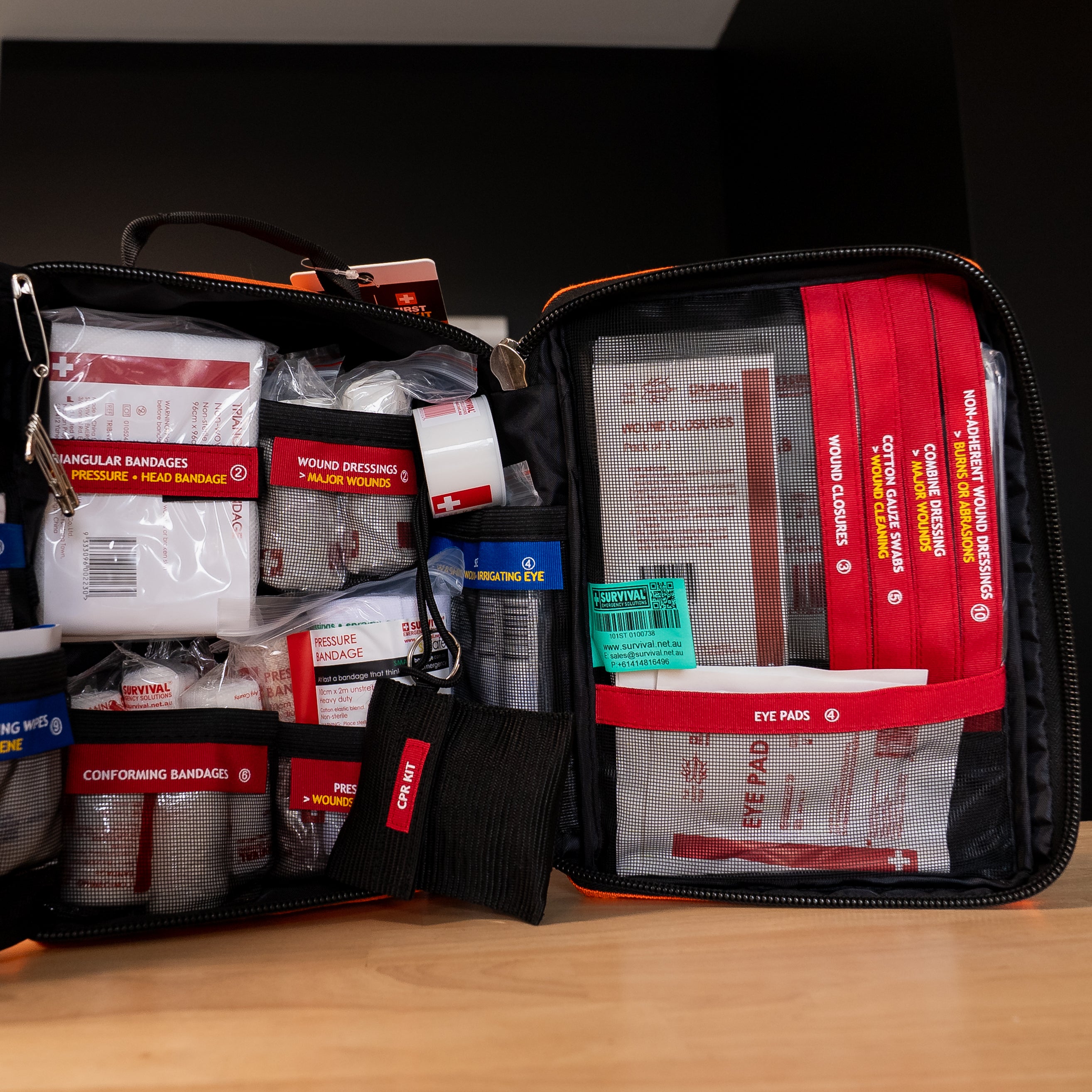 Sterile dressings (multiple sizes), conforming bandages, combined dressings, trauma / pressure bandages, triangular bandages, non-adherent dressings, CPR face shield kit, gloves, tweezers, safety pins, splash antiseptic wipes, saline flushes, instant cold pack, wound care strips, rescue blanket, eye pads, splinter probes, first aid manual, burn gel, and more.